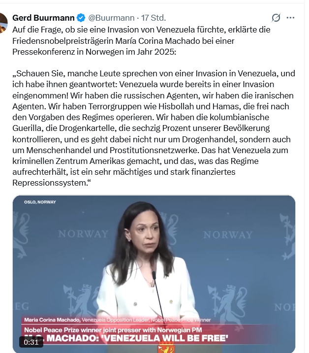 AlexRE hat geschrieben: 04.01.2026, 10:40 Trump wimmelt die Oppositionsführerin und Friedensnobelpreisträgerin Machado ab: